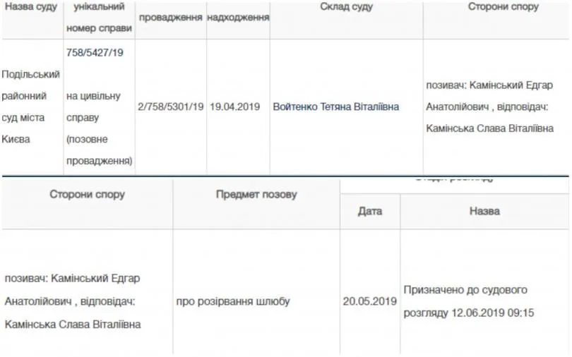Заява про розлучення Камінських з'явилася на сайті Подільського районного суду. Едгар Камінський подав на розлучення 19 квітня 2019 року. Розірвання шлюбу відбудеться 12 червня 2019 року.