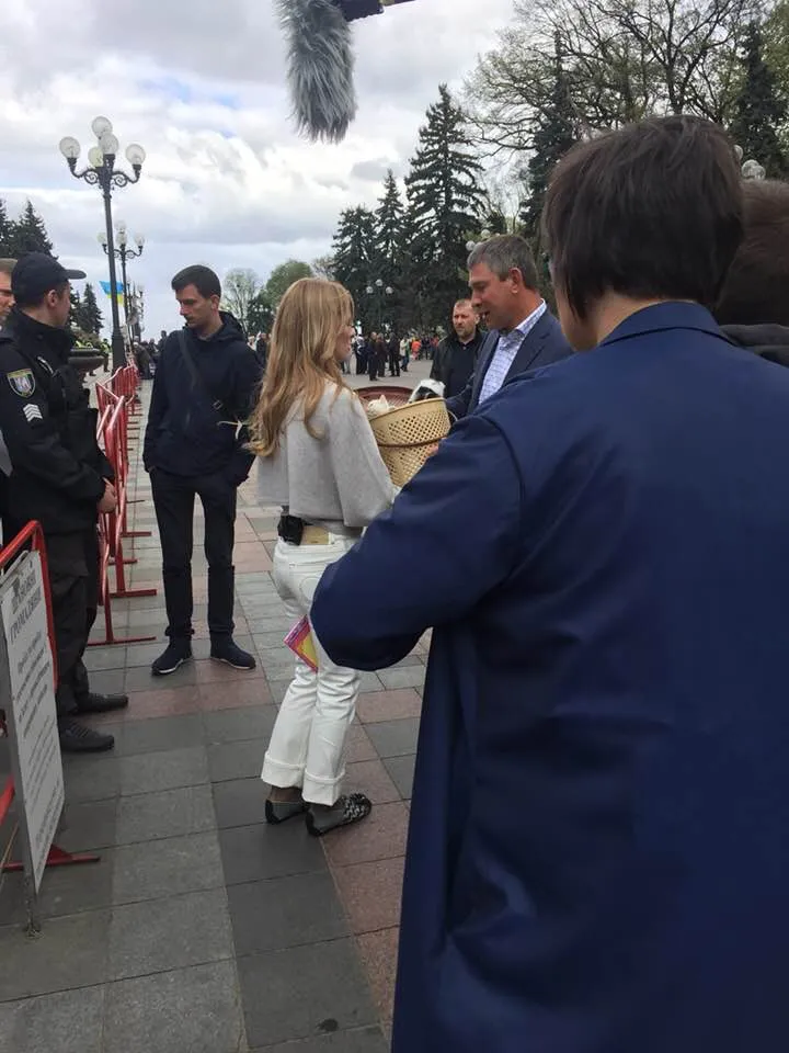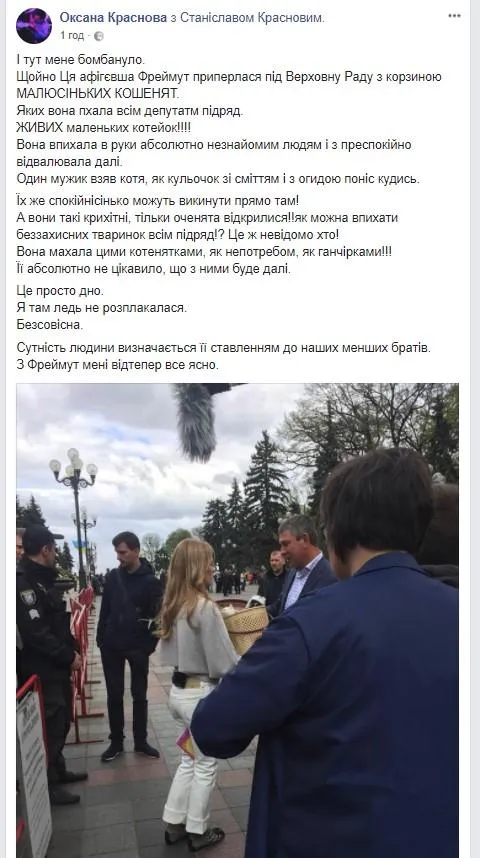 Одна з користувачок мережі Facebook Оксана Краснова поділилась дописом, в якому можна побачити, як Ольга Фреймут тримає корзину, наповнену маленькими кошенятами. За її словами, телеведуча "пхала" тварин всім перехожим під Верховною Радою.