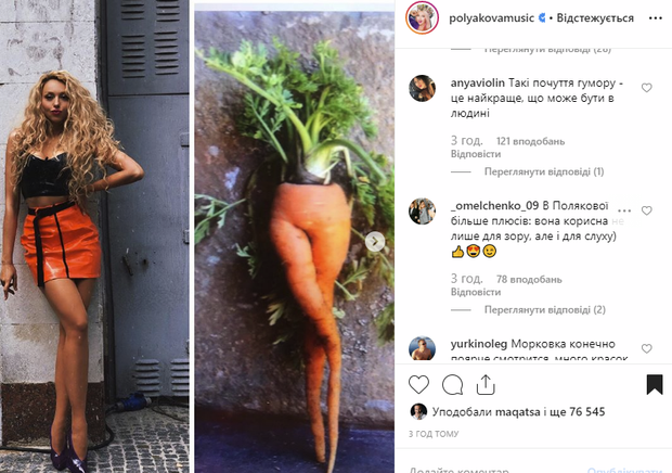 Проте запальна Оля Полякова вирішила порівняти свій знімок зі звичайною морквиною. Помаранчевий колір нагадував її спідницю, а поза зірки зі схрещеними ногами була такою ж, як і в овоча. У коментарі до допису співачка жартома запропонувала підписникам обрати краще фото, на що вони миттєво відреагували. Одні засипали Олю Полякову компліментами, а інші – обрали морквину.