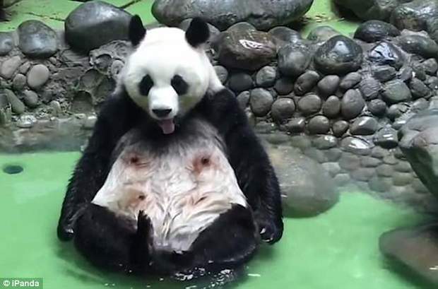На відео панда виглядає доволі розслабленою, використовуючи свої лапи, щоб облити себе водою.