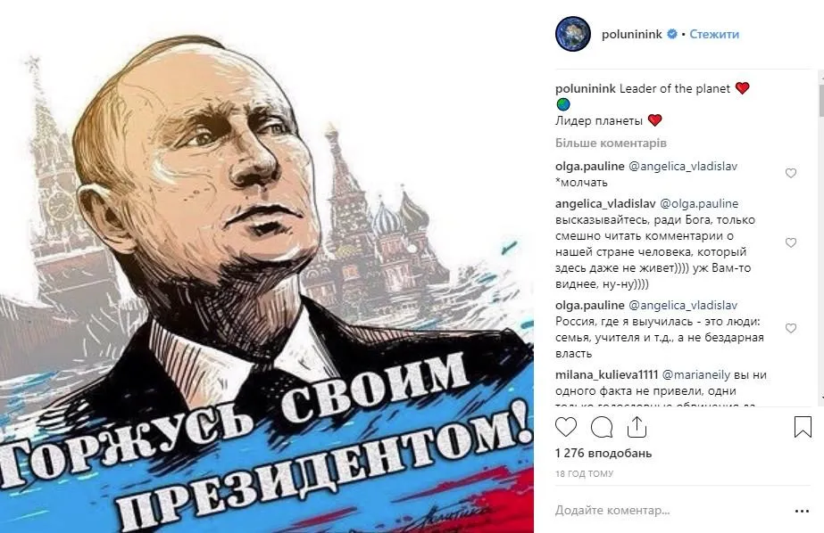 Що цікаво, основна сторінка Сергія Полуніна, на якій він почав зізнаватися у коханні до Путіна та демонструвати татуювання з президентом Росії на грудях, вже видалена. Згодом танцівник створив другий офіційний блог у соціальній мережі Instagram, де почав писати ще більш провокативніші публікації.