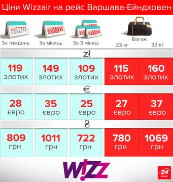 Приміром, якщо ви вирішили летіти з Wizzair з Варшави до Ейндховена, ціна за тиждень до відльоту буде 119 злотих (28 євро, або 809 грн). За місяць квиток коштуватиме дорожче – 149 злотих (35 євро, або 1011 грн). А от за три місяці – найдешевше – 109 злотих (25 євро, або 722 грн). За багаж вагою 23 кг доведеться доплатити 115 злотих (27 євро, або 780 грн), за 32 кг – 160 злотих (37 євро, або 1069 грн).