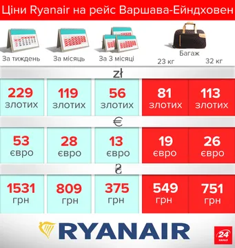 Якщо на цю дату летіти з Ryanair з тієї ж Варшави до Ейндховена, то за тиждень квитки коштуватимуть 229 злотих (53 євро, або 1531 грн), за місяць – 119 злотих (28 євро, або 809 грн), за три місяці найдешевше – всього 56 злотих (13 євро, або 375 грн). За валізу 15 кг – доплата 81 злотих (19 євро, або 780 грн), за двадцятикілограмову валізу – 113 злотих (26 євро, або 751 грн).