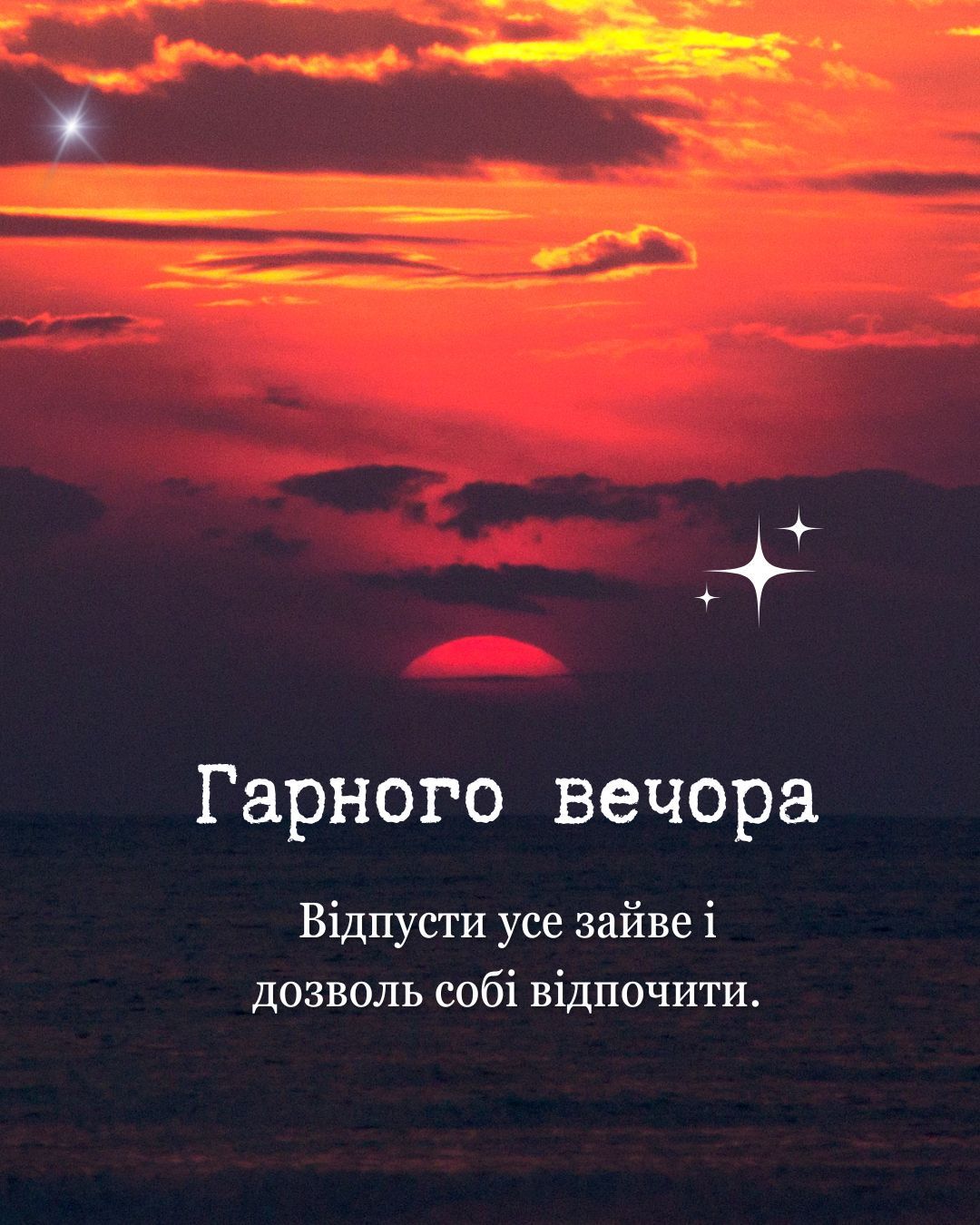 Хочу побажати тобі доброго вечора і прекрасного відпочинку. Відпочивай, насолоджуйся єднанням з собою і пам'ятай, що я тебе люблю!