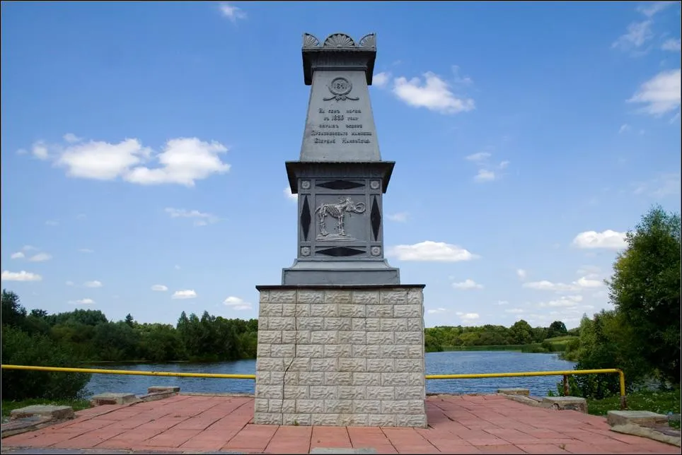 Оригінальний пам’ятник складається з чотиригранної металевої стелли, на гранях якої вказаний 1841 рік. На пам’ятнику зображений барельєф мамонта, а також згадується інформація про археологічну знахідку та її цінність для історії. Така архітектурна пам’ятка автора Івана Калениченка була зведена першою у світі на честь доісторичного велетня і також стала нагадуванням про ще одну знакову подію – в цьому місці проходив кордон між Росією і Річчю Посполитою.