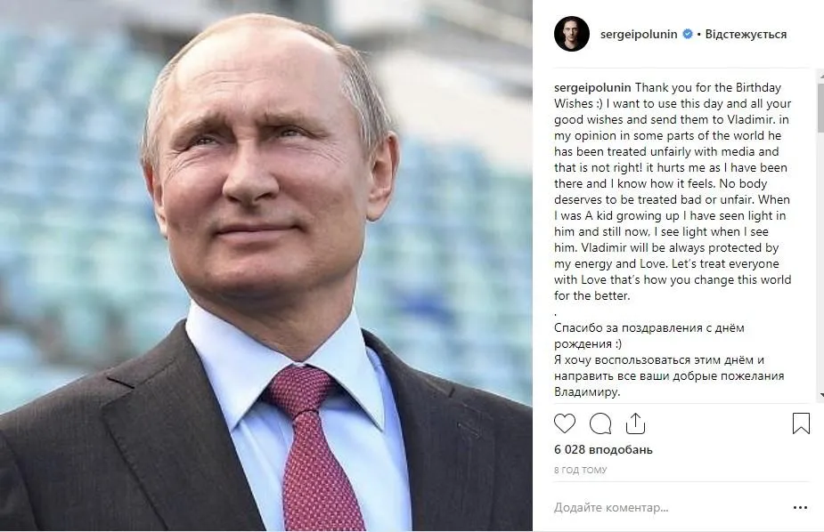 Полунін написав, що ще з дитинства бачив у Путіні "світло". Про це танцівник повідомив на своїй сторінці в Instagram.