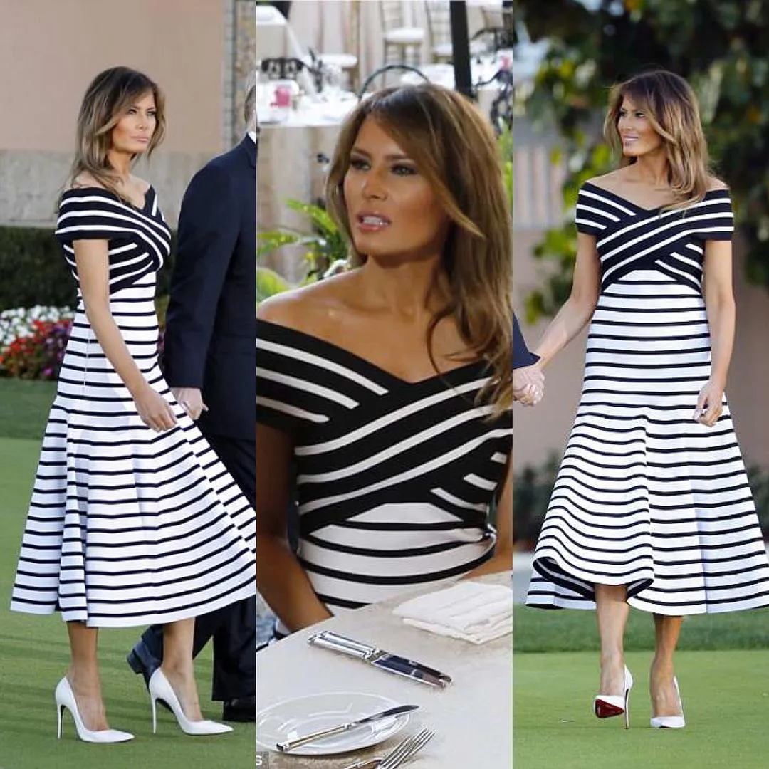 Меланія Трамп, як і завжди, виглядала дивовижно. Перша леді США вбрала ефектну сукню-міді Carolina Herrera в чорно-білу смужку. Легкий весняний образ дружина Президента доповнила білими туфлями на підборах від бренду Christian Louboutin. Макіяж з акцентом на очі та ідеально вкладене волосся довершили витончений образ Меланії Трамп.