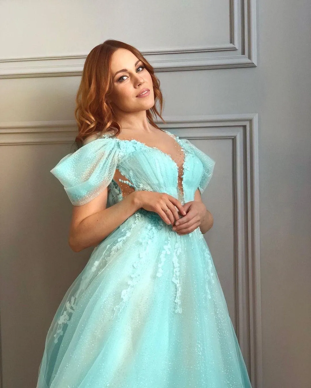 Alyosha позувала на білому тлі, ніжно дивлячись в об'єктив. Вона постала в бездоганному образі, одягнувши розкішну блакитну сукню з широкими бретелями, що спадали на плечі, оригінальним декольте з мереживом та широкою спідницею зі світлими вставками.