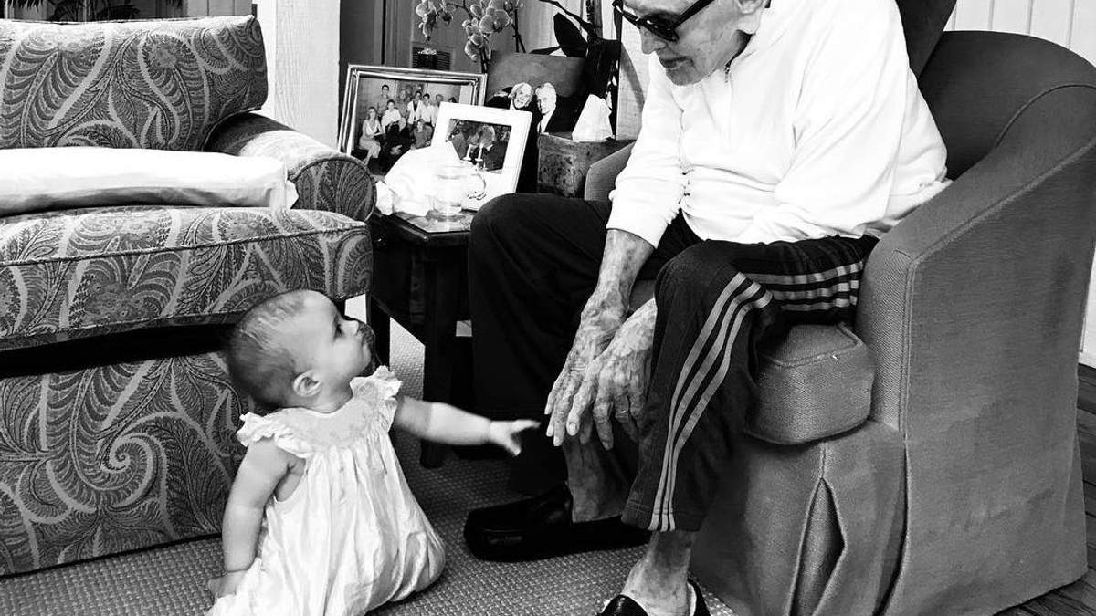 Легенда кино на черно-белом снимке сидит в кресле и внимательно наблюдает за маленькой правнучкой.