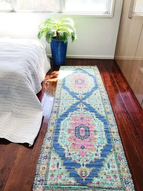 А в спальне ковер надо размещать перпендикулярно к кровати, а не вдоль.