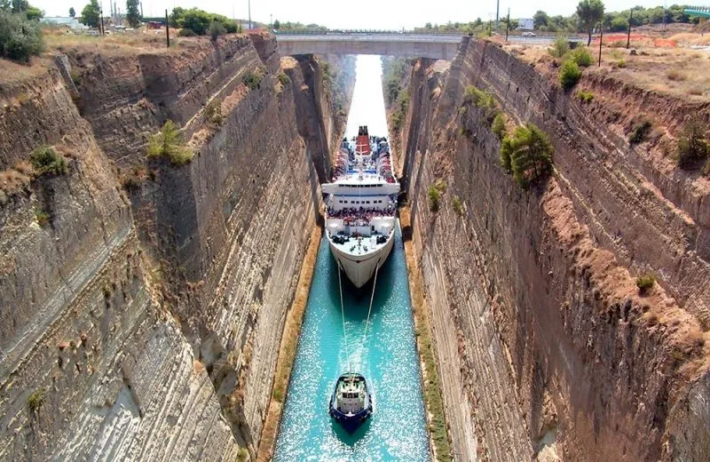 Коринфский канал, длиной в 6 километров, открыли в 1893 году. Он соединяет Ионическое и Эгейское моря, а главное – сокращает морской путь кораблей на 400 километров.