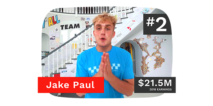 Второе место в рейтинге занял американский актер и видеоблоггер Jake Paul, который имеет 17,5 миллионов подписчиков и заработал на канале около 21,5 миллионов долларов.