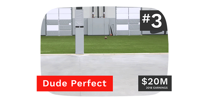 Тройку лидеров закрыл канал под названием Dude Perfect, 36 миллионов подписчиков. За свою работу, команда из пяти человек-Коби Коттон, Кори Коттон, Тайлер Тони, Гаррет Гильберт и Коди Джонс, заработала 20 миллионов долларов.