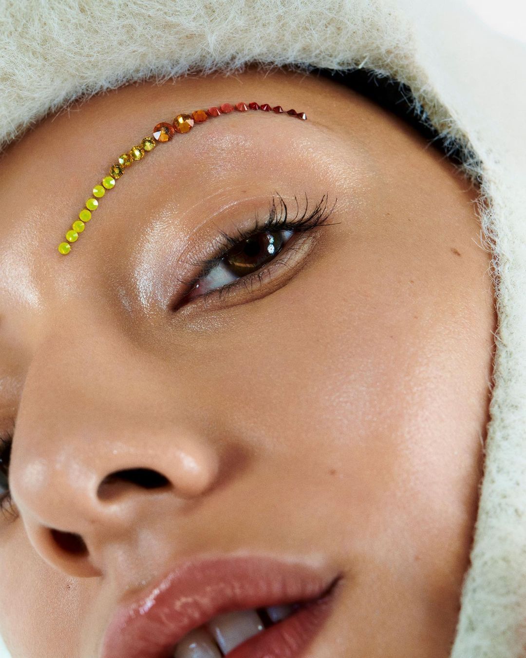 Эпоха Y2K покажется и в оригинальном способе делать акцент (или наоборот) на бровях. Их можно осветить, как это сделал MarcJacobs и Givenchy на своих показах или полностью сбрить – на такое решение решилась Doja Cat. Певица действительно произвела фурор образом из тысячи кристаллов Swarovski, который и пугал, и восхищал.