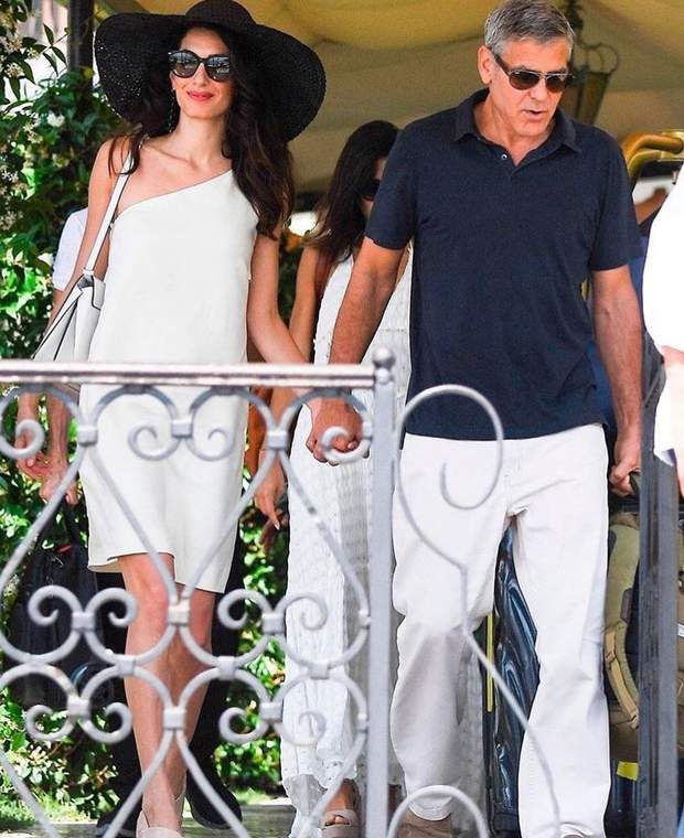 Так, возле отеля Belmond Hotel Cipriani Джордж и Амаль Клуни были замечены в летних будничных образах и в хорошем настроении. Стоит отметить, что 41-летняя известная юристка даже на отдыхе выбирает платья на одно плечо, в которых неоднократно появлялась на публике. На этот раз ее выбор пал на белоснежное платье до колен, а также черную широкополую шляпу. Образ завершили сумка в тон к наряду и темные солнцезащитные очки.