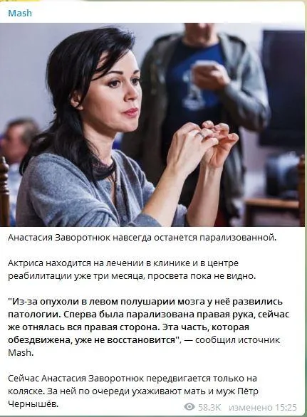 Как писал телеграмм канал Mash, Заворотнюк передвигается только на коляске, а за ней по очереди ухаживают мать и муж Петр Чернышев.