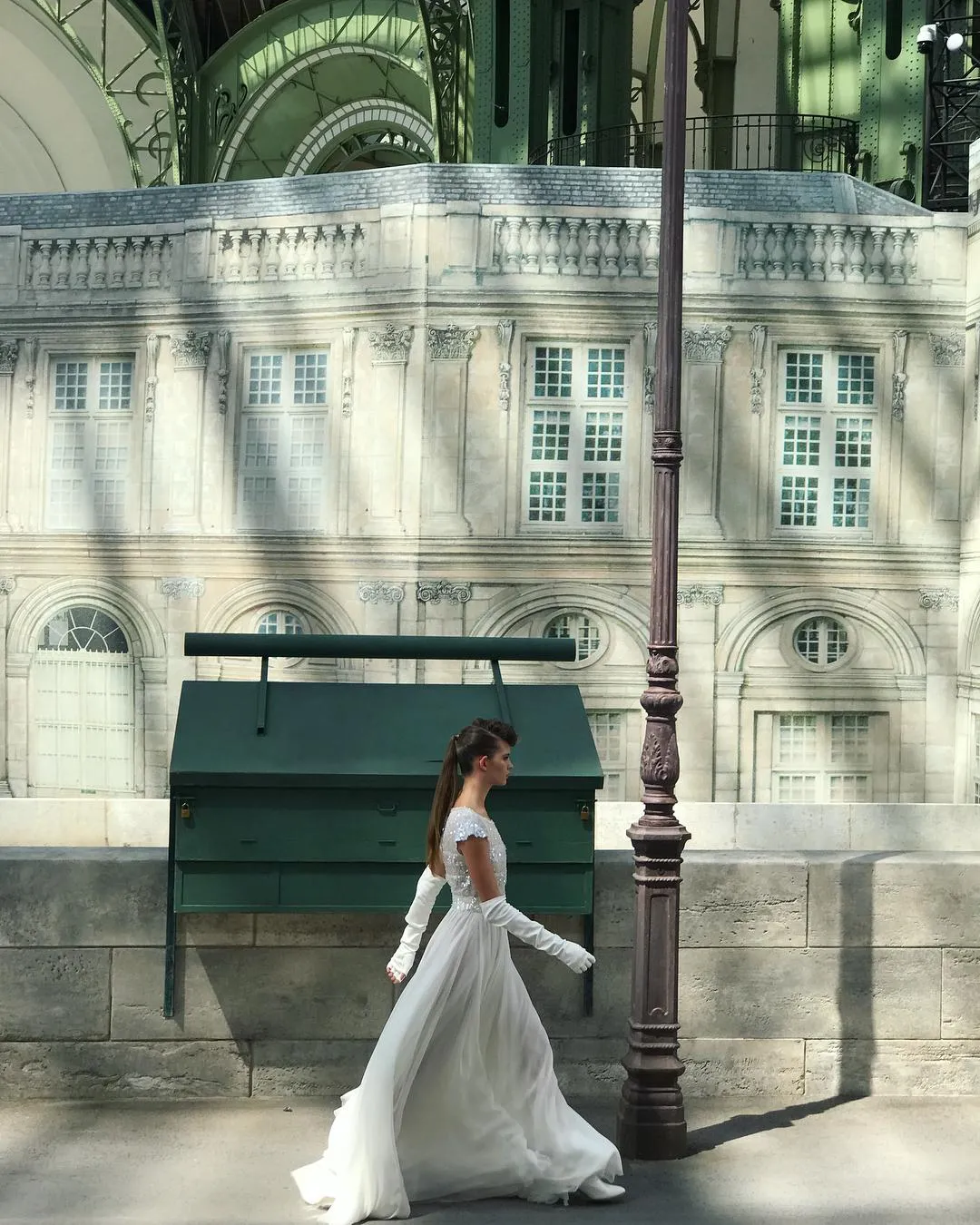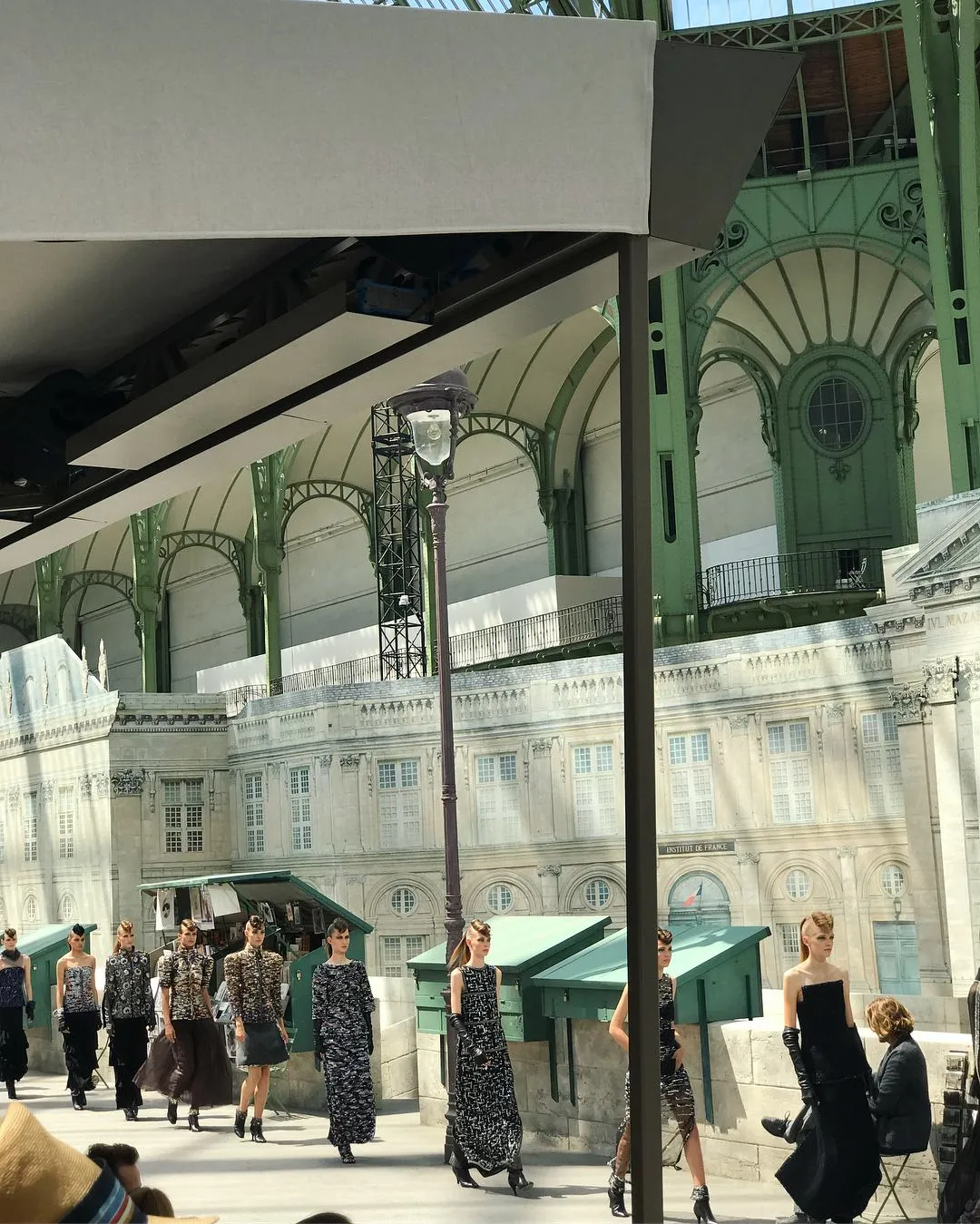 Подиум оформили как набережную Сены – с лотками продавцов, торгующих пластинками, книгами и журналами, а также и с продавцами, которые сидели вдоль и смотрели на моделей.