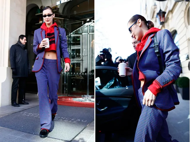 После завершения Недели моды в Милане, Белла Хадид отправилась в Париж, где показала свой стильный "лук". В нем она соединила три модных весенних тренда: клетку, ультрафиолет и микроочки.