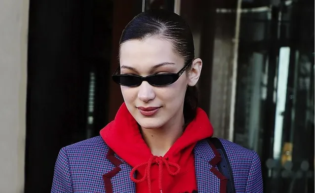 Брючный костюм-двойка идеально подходил Белле. Под жакет она подобрала стильное худи красного цвета, подчеркнув весь образ черной обувью и черными микроочками, – последний тренд сезона.