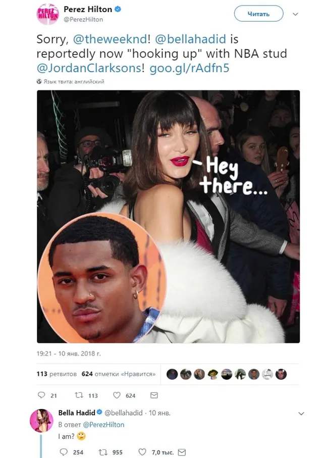 "Прости, The Weeknd! Говорят, что Белла Хадид встречается с игроком NBA Джорданом Кларксоном", — написал он.