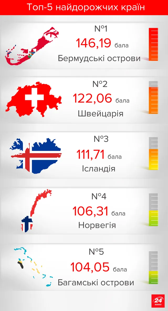 Возглавили список Бермудские острова, Швейцария, Исландия, Норвегия и Багамские острова – стоимость жизни в этих странах превышает стоимость в Нью-Йорке.