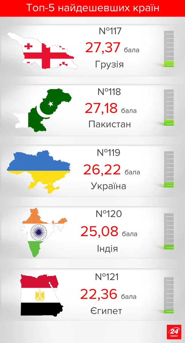 А вот на другом полюсе (всего в списке 121 страна) нашлось место и для Украины, и для еще одной страны бывшего СССР.