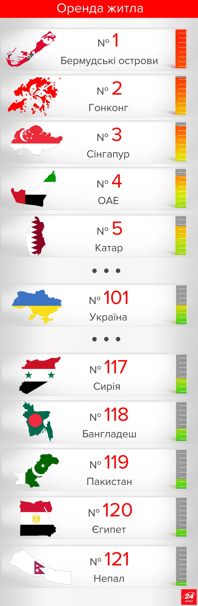 Если говорить о стоимости аренды жилья, то самой высокой она является на Бермудах, самой низкой – в Непале, а Украина по этому показателю занимает 101 место.
