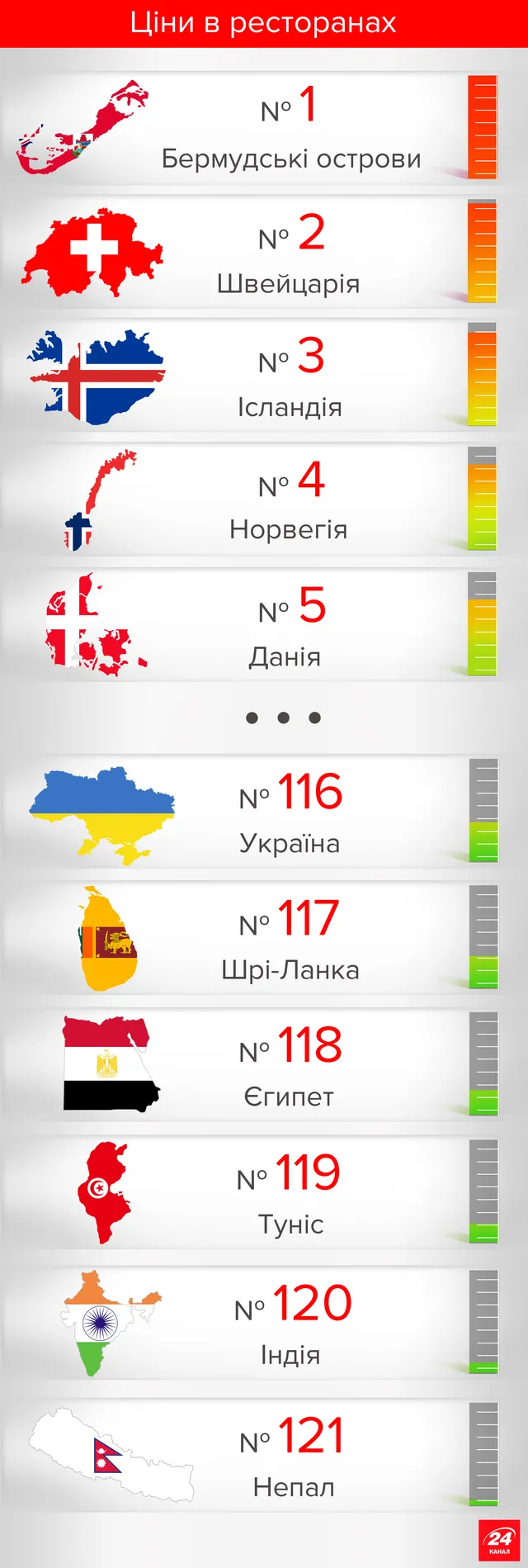 Бермуды занимают первое место и в списке стран с самыми дорогими ресторанами, а компанию в ТОП-5 им составляют европейские страны (Швейцария, Исландия, Норвегия и Дания). Сто шестнадцатое место за Украиной, а дешевле всего поход в ресторан обойдется в Непале.