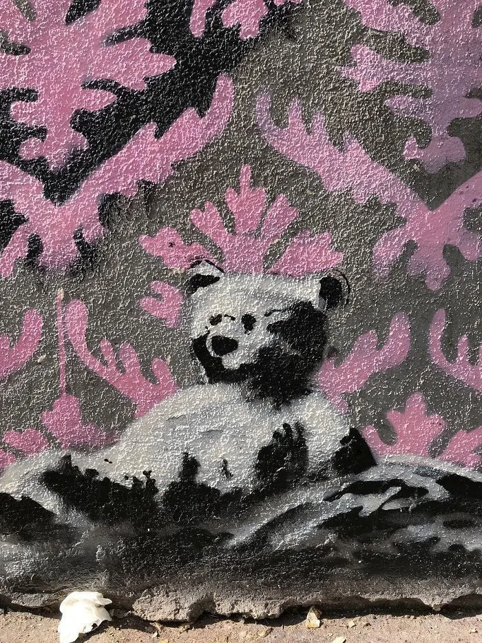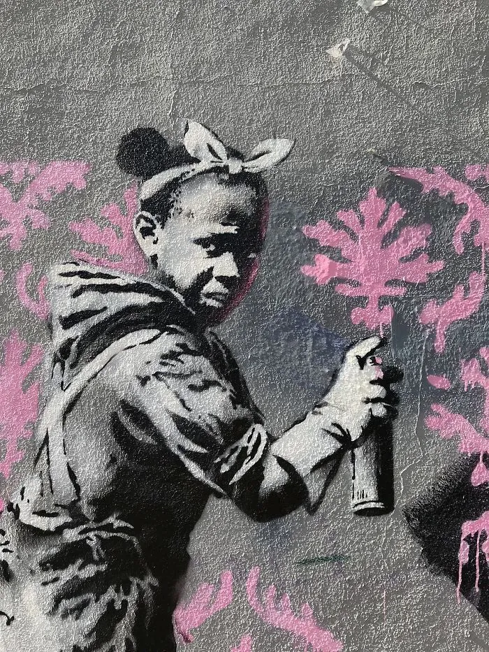 На одном из провокационных рисунков изображена чернокожая девочка, которая наносит розовый трафарет на символ свастики. Это граффити очень быстро зарисовали синей краской, но фото рисунка распространилось сетью.