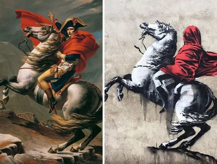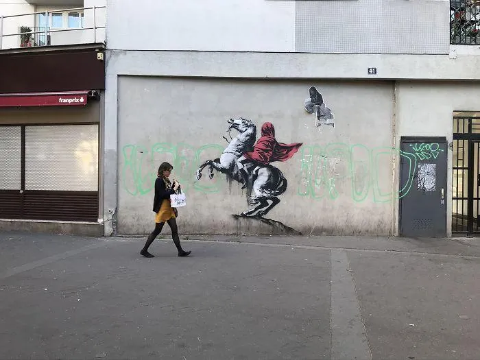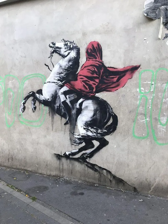 На еще одном рисунке можно увидеть отсылку к картине Жака Луи Давида "Наполеон на перевале Сен-Бернар", но в интерпретации уличного художника Наполеон укутанный собственным плащом.