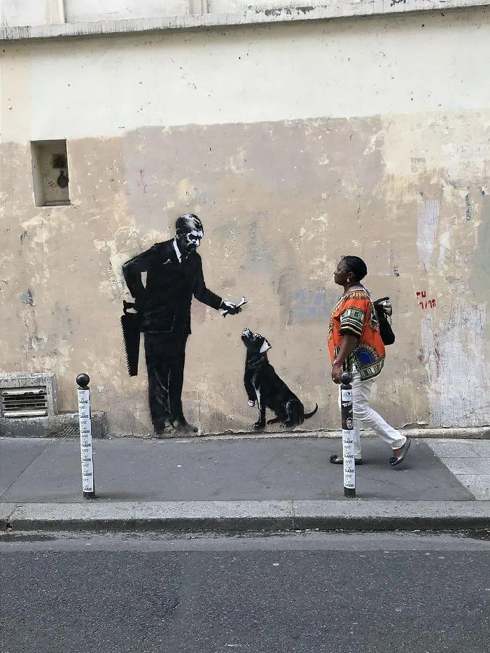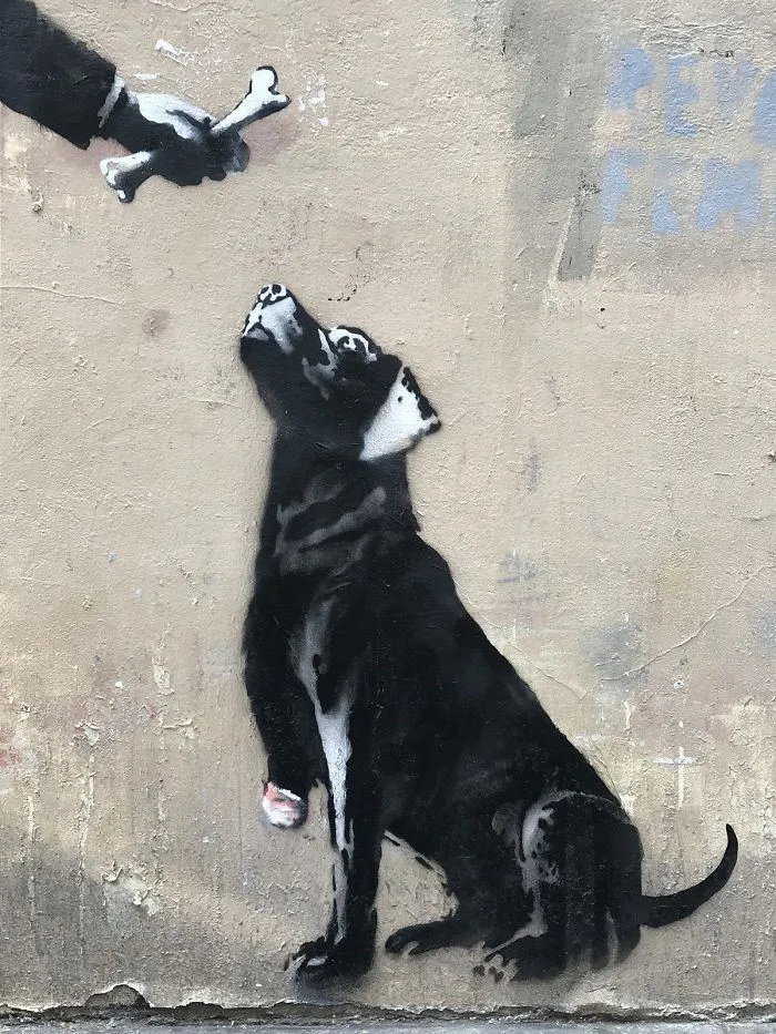 Также Бэнкси изобразил старого мужчину с пилой в руке, который протягивает собаке косточку. Однако у самого животного отпилена лапа.