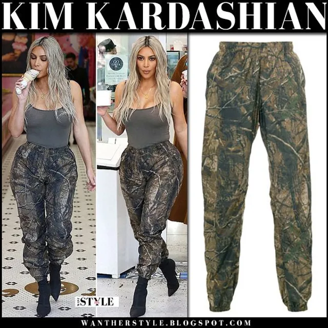 Ким Кардашян в брюках с принтом камуфляжа из линейки Yeezy Season 5