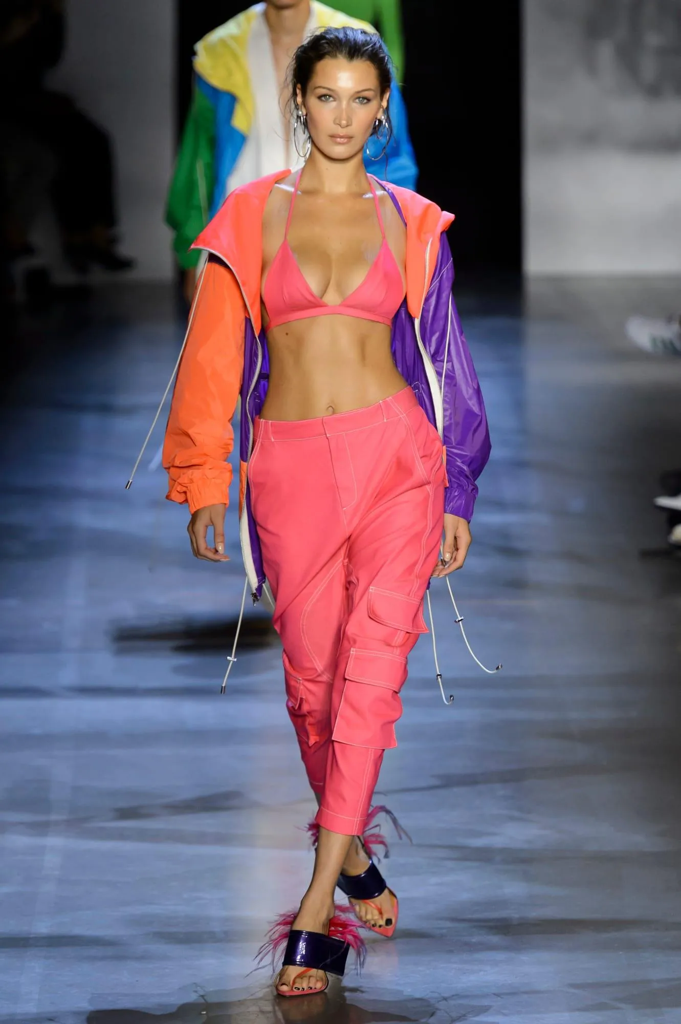 Например, в карго одел моделей итальянский дизайнер Прабала Гурунг. В его шоу участвовала знаменитая модель Белла Хадид, которая показала розовые неоновые штаны с большими карманами и топ такого же цвета.