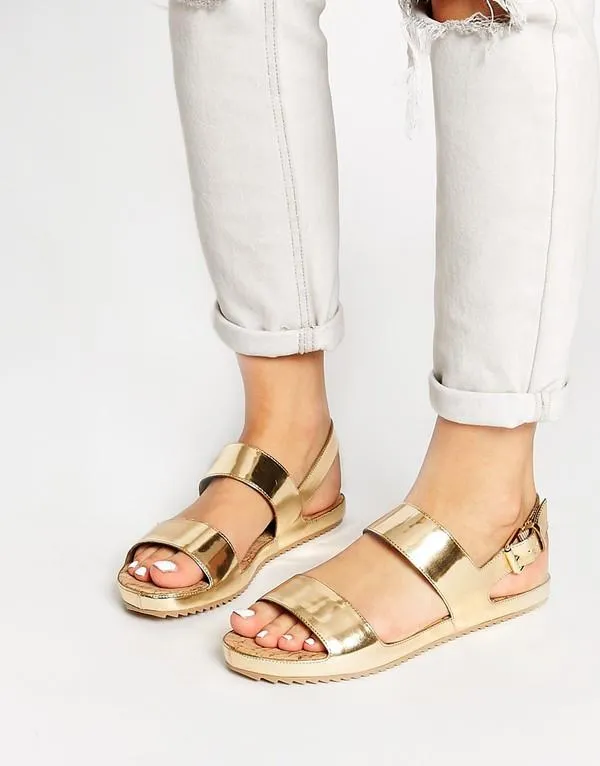 Сандалии с двумя ремешками роскошно будут смотреться с платьями. Выбирайте поверхность кожаную или металлик.