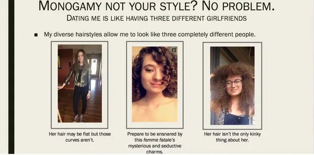 В презентации Лиззи рассказывает, почему она просто идеальная пара и почему парень должен выбрать именно ее. Например, она может поддержать любую беседу и стильно одеться на День благодарения.