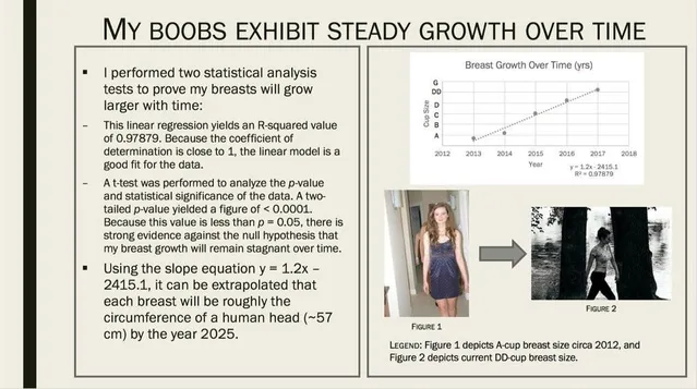 Также девушка заверила, что у нее грудь, которая постоянно растет и к 2025 году достигнет размера человеческой головы. Как доказательство Фентон прикрепил диаграмму роста груди с 2012 по 2017 год.