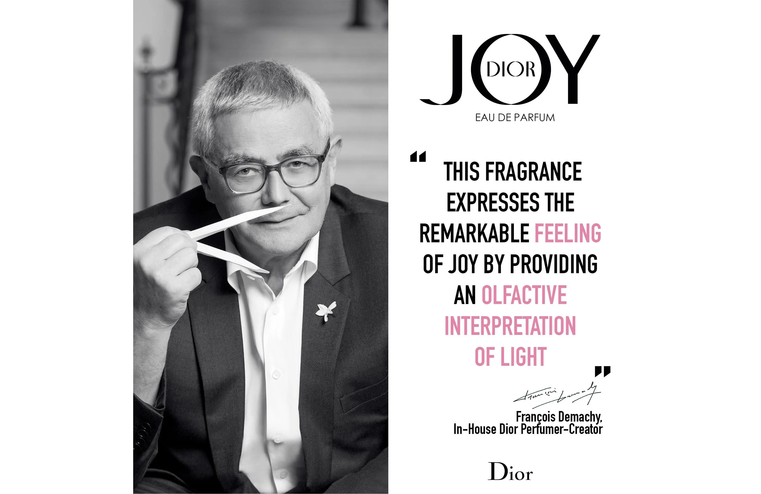 28-летняя звезда снялась в мини-фильме Joy by Dior, режиссером которого стал Фрэнсис Лоуренс. По словам представителей Dior, в парфюмерной новинке можно почувствовать ноты бергамота, мандарина, жасмина, розы, а также сандала, мускуса и пачули. Франсуа Демаши, который стал создателем новых духов, отметил, что аромат является "мощной вселенной, отмечающей новую эпоху в парфюмерной линейке дома Dior".