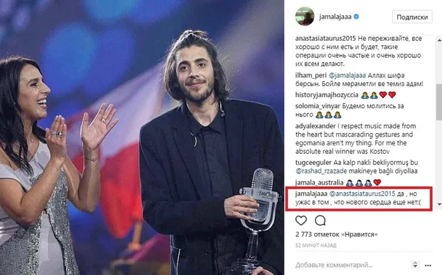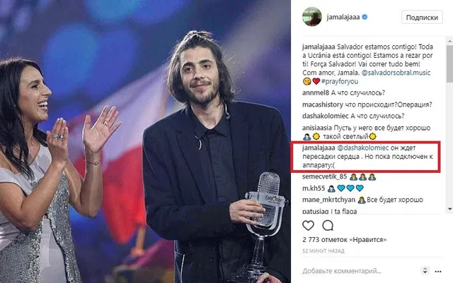 Сейчас победитель "Евровидения-2017" готовится к операции и ждет донорское сердце. Однако его до сих пор нет и сейчас он подключен к аппарату, который поддерживает его жизнь: это также подтвердила и Джамала в комментариях к своей публикации.
