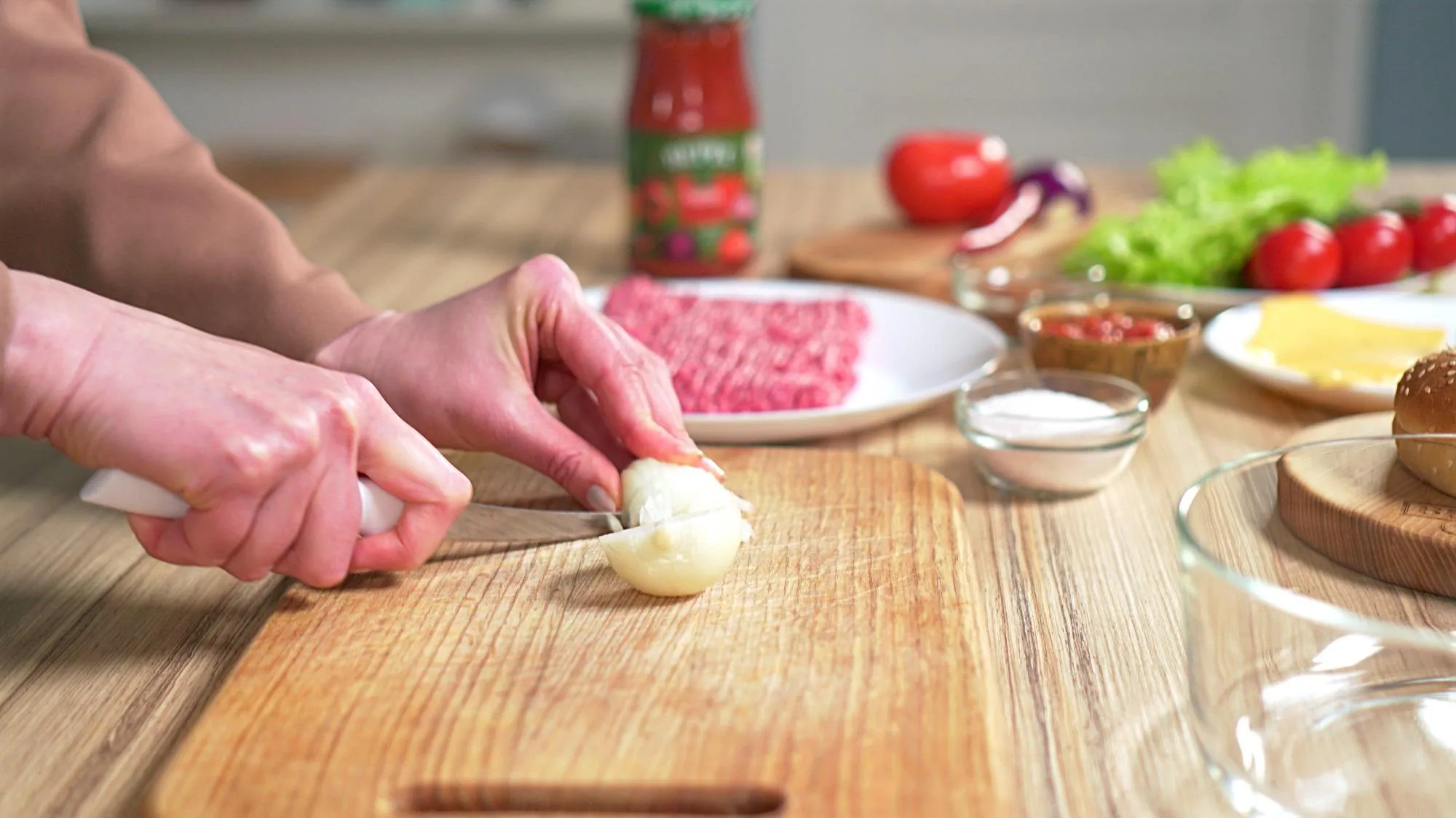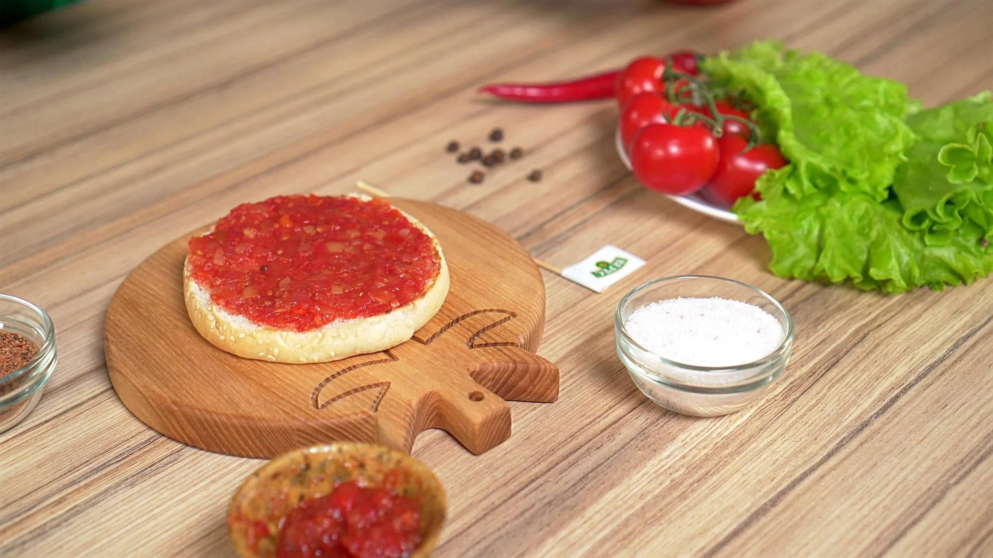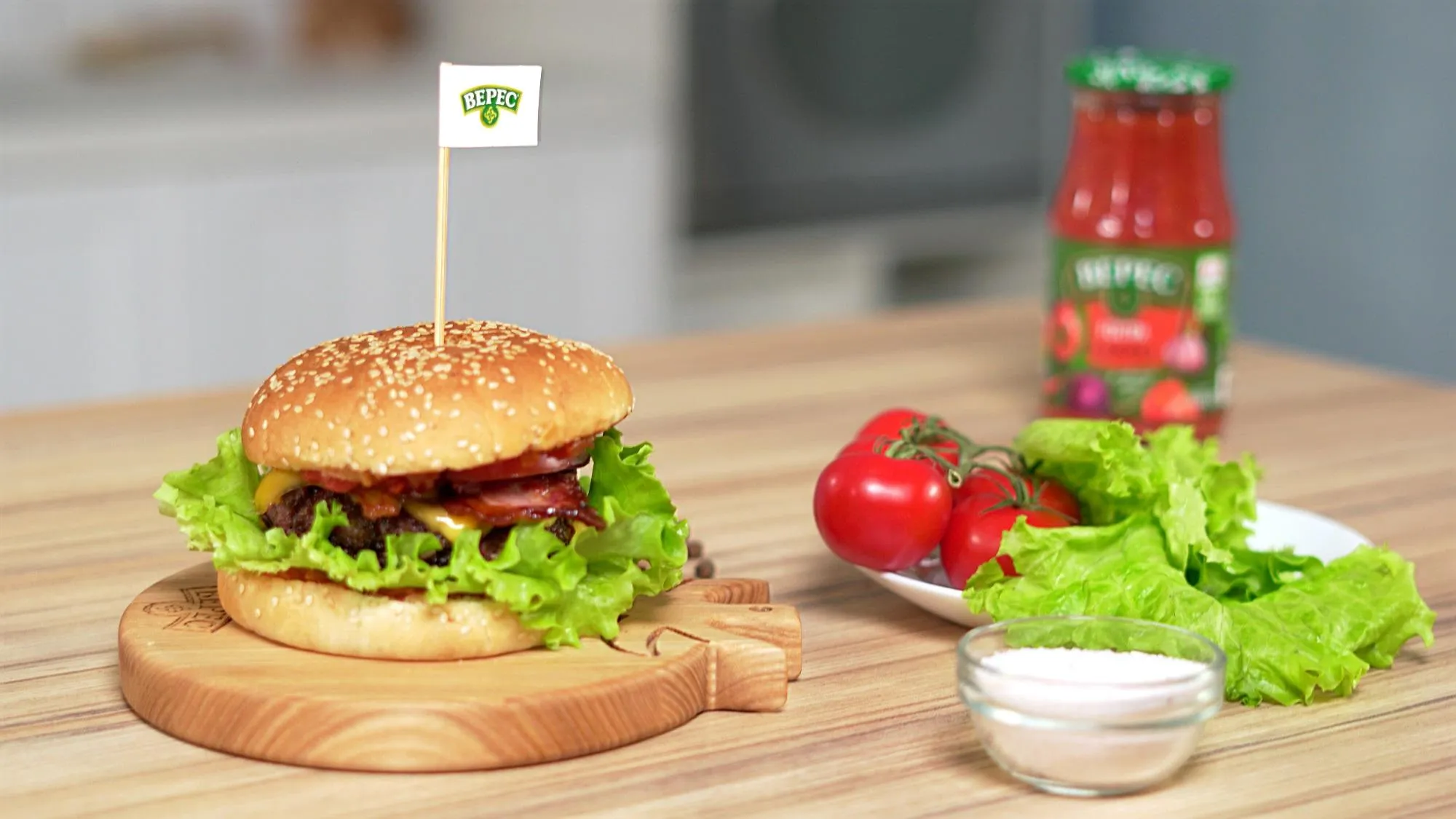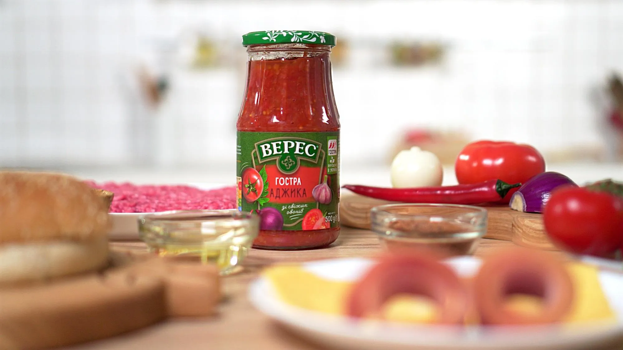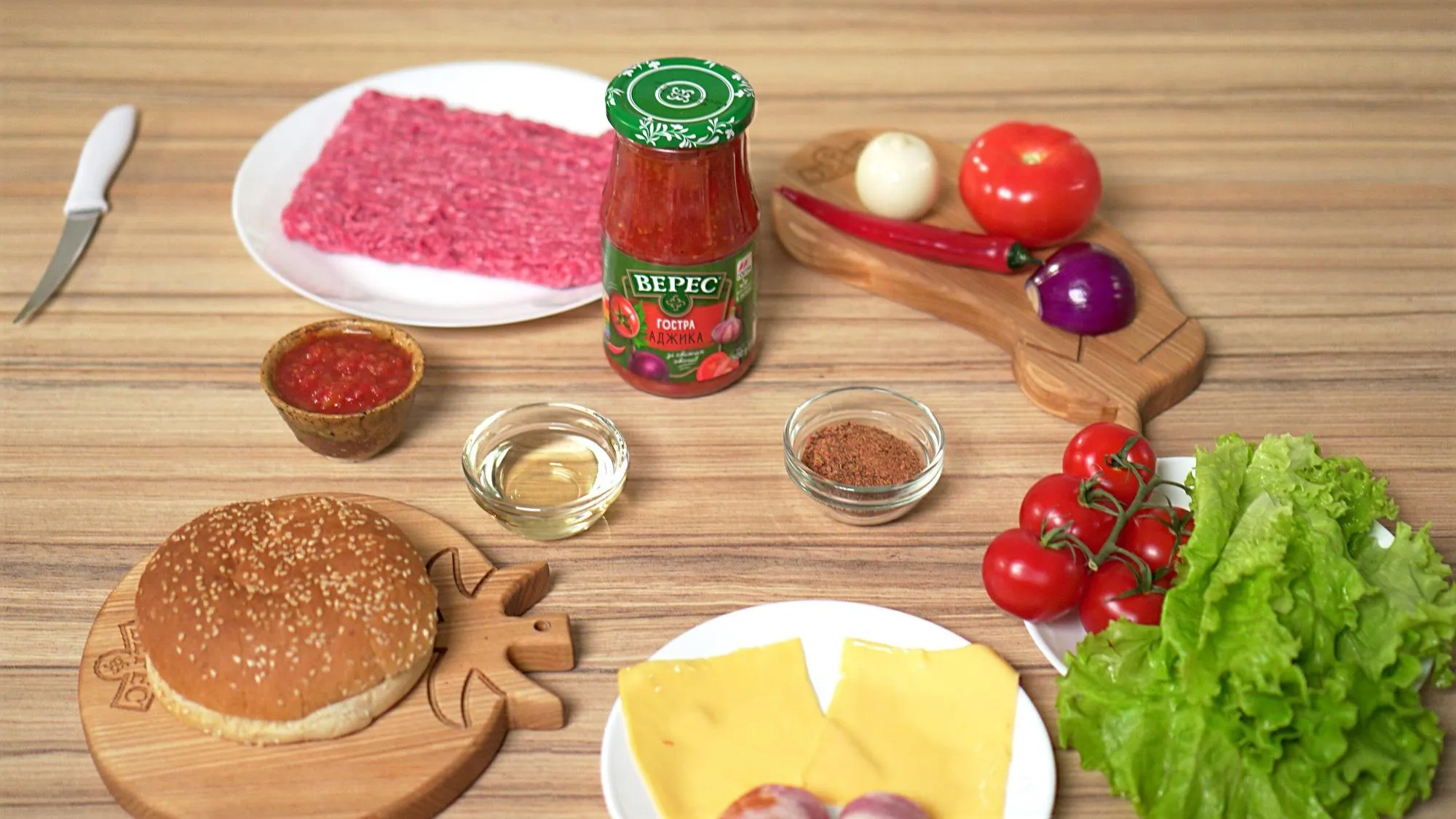 Теперь перейдем к самому интересному – нашему фирменному рецепту. Гамбургеры дома получатся особенно вкусными, если готовить их с острой аджикой "Верес" из свежих отборных томатов, лука и сладкого перца.