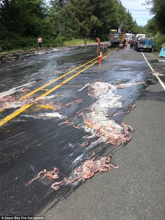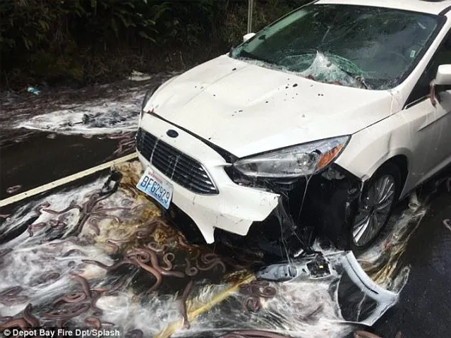 В результате ДТП, все содержимое контейнеров оказался на дороге. А поскольку угри выделяют огромное количество слизи из-за стресса (так они отпугивают хищников), они превратили кусок дороги в сцену из фильма ужасов, облепив даже автомобили, которые проезжали мимо.