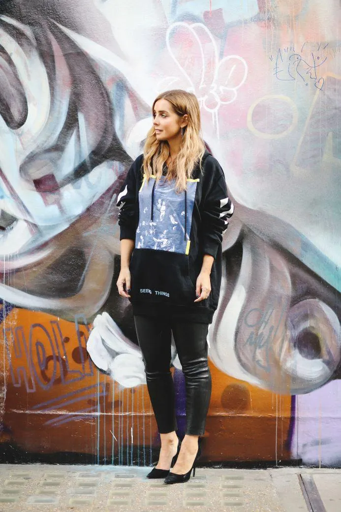 В то же время кофту с капюшоном теперь комбинируют с любым образом: и с каблуками, и с шелковыми юбками, и с кожаными штанами.