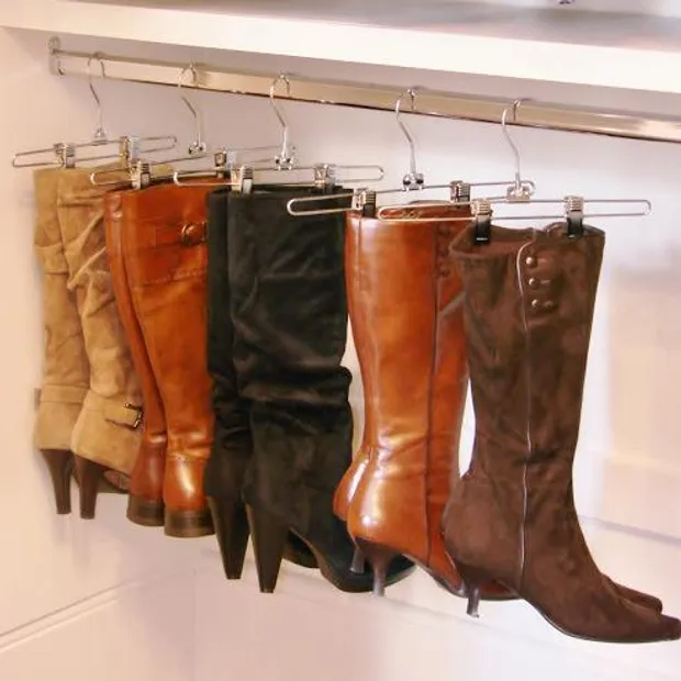 Кстати, довольно удобно хранить сапоги в шкафу на вешалке. Для этого создали даже специальные устройства. Впрочем, можно сделать такое и самому. Понадобится зажим для бумаги и вешалка. Биндером скрепляем сапоги и цепляем их на вешалку, а затем размещаем в шкафу. Можно также использовать вешалку для брюк. Но в таком варианте нужно будет защитить сапоги от повреждений мягкими тряпками.