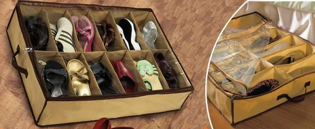 Если вариант с вешалками вам не подходит, можно сложить обувь в коробки, чтобы любимая пара не помялась при долговременном хранении. Кто-то пользуется пластиковыми ящиками или специальными контейнерами. А еще кто-то складывает обуви в один большой органайзер для экономии места. Его можно приобрести в хозяйственном магазине. Органайзеры бывают различных форм и размеров. А стоят от 100 до более 300 гривен.