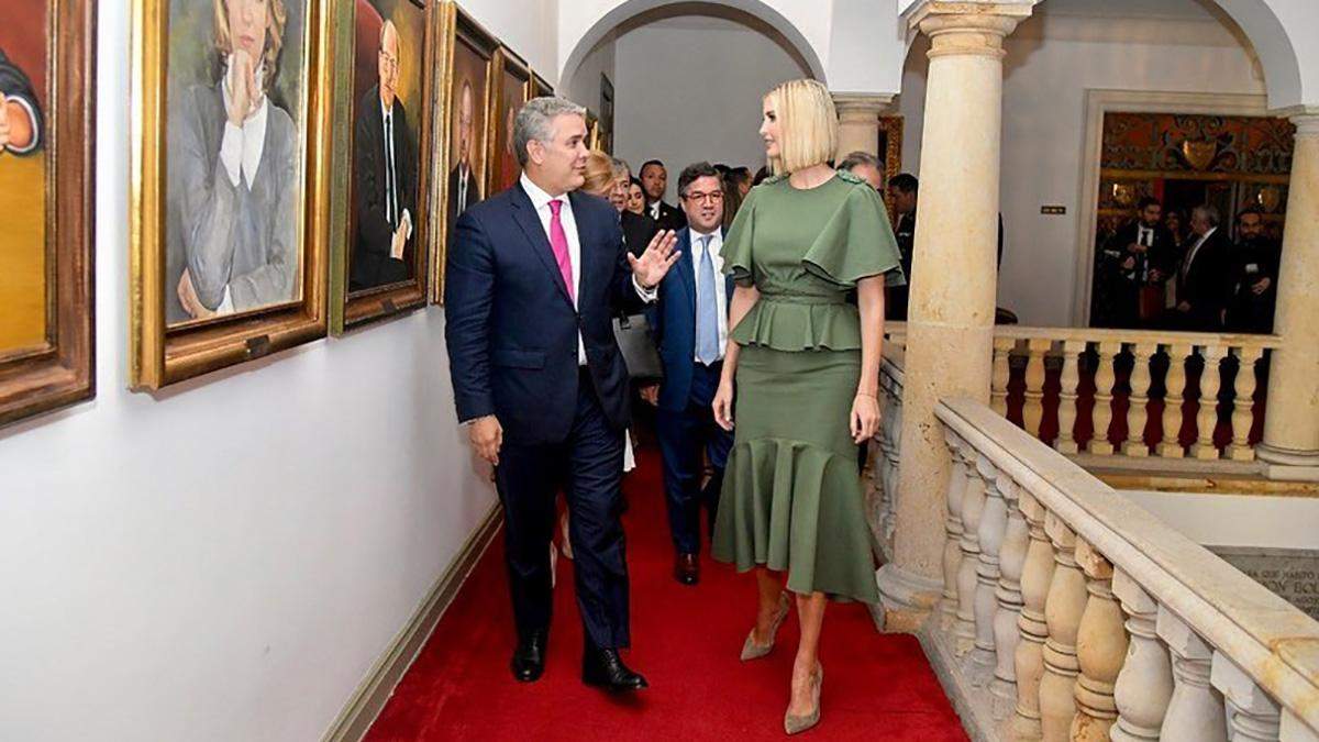 Так, 3 сентября представитель Белого дома побывала в Академии национальной политики имени генерала Сантандера, в Боготе. Сопровождала Иванку Трамп вице-президент Колумбии Матха Люсия Рамирес. Однако благодаря удачно подобранной одежде американка сумела затмить всех на официальной встрече.