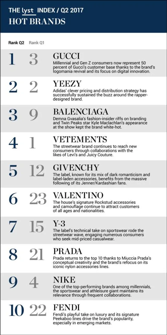 В первом квартале 2017 года первое место занимал бренд Vetements, однако сейчас он переместился на 4 место. Второе и третье место заняли Yeezy и Balenciaga.