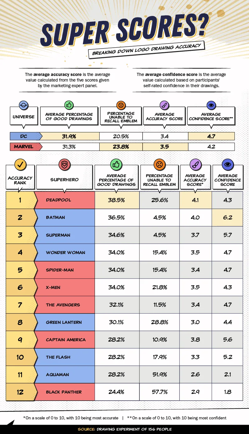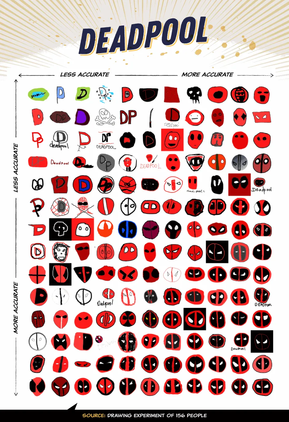 Эмблема супегероя комиксов Marvel – Дэдпула, была более или менее точно воссоздана 38,5% участниками эксперимента. На втором и третьем месте разместились персонажи Бэтмен и Супермен с показателями точности 36,5% и 34,6% соответственно. Хуже опрошенные справились с логотипами Черной Пантеры (24,4%), Аквамена (28,2%) и Флэша (28,2%).