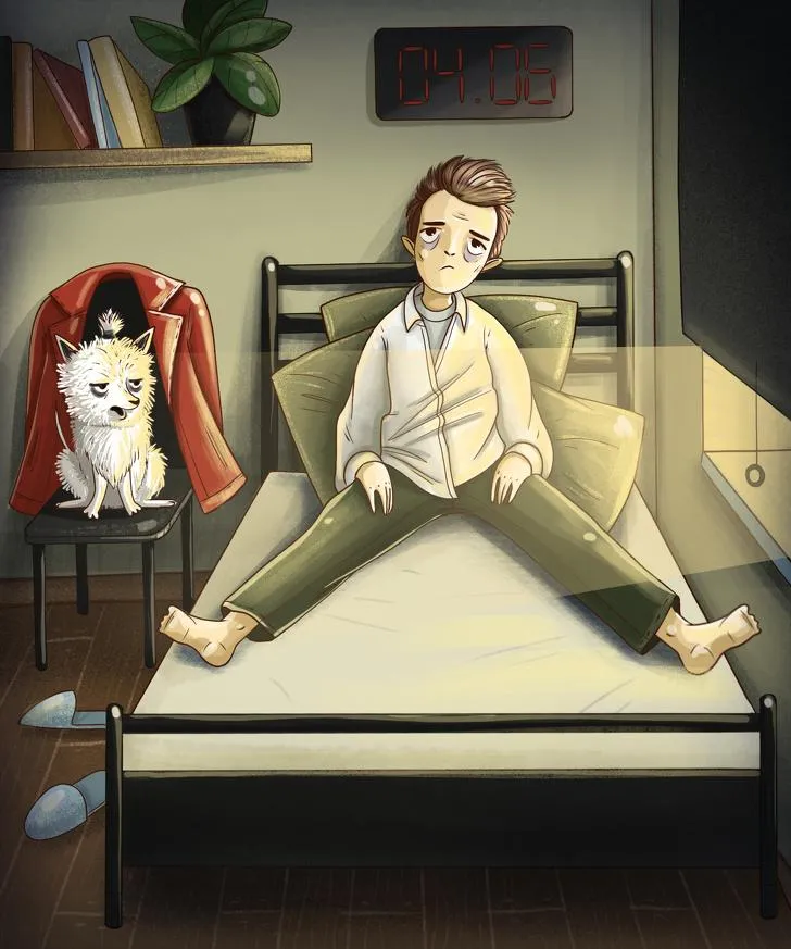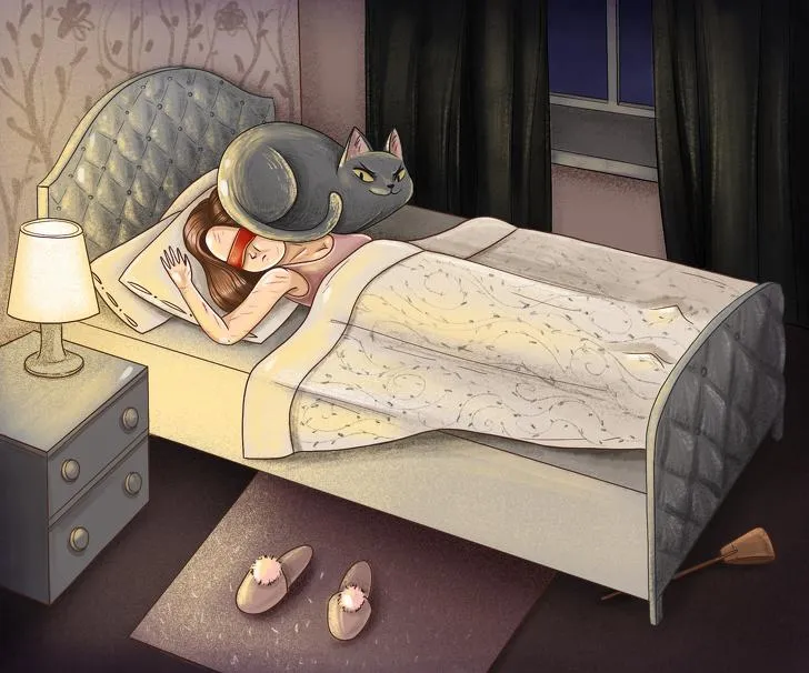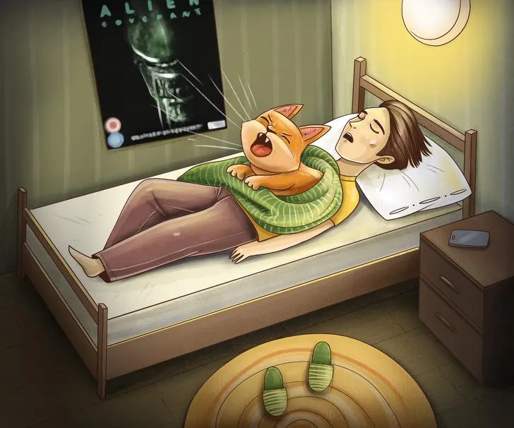 Много картинок посвящены и домашним любимцам. Собаки, которые постоянно в ожидании утра за дверью спальной комнаты – это "Хатико". А коты, которые гуляют по хозяину всю ночь, – настоящие чужие из известного научно-фантастического фильма ужасов.