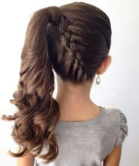 Заплетите колосок или французскую косу снизу вверх, соблюдая диагональную линию. Завяжите волосы в высокий конский хвост.