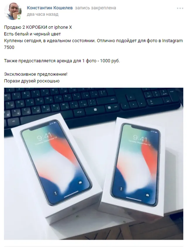 Продаю 2 коробки от iPone X. Есть белый и черный цвет. Купленные сегодня, в идеальном состоянии. Прекрасно подойдут для фото в Instagram. 7500 рублей. Также представляется аренда для 1 фото — 1000 рублей. Эксклюзивное предложение! Удивите друзей роскошью,