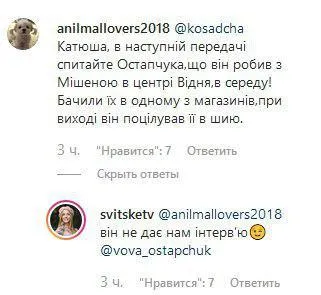 2 декабря в сети появилась информация, что известный ведущий отправился в Австрию. Пользовательница сети с ником @animallovers2018 написала, что видела, как Владимир Остапчук был в компании актрисы Ксении Мишиной. Украинка попросила у ведущей "Светской жизни" поинтересоваться, встречаются ли звезды. Женщина добавила, что шоумен также целовал Мишину в шею. Другая девушка в комментариях отметила, что тоже видела Остапчука в Вене.